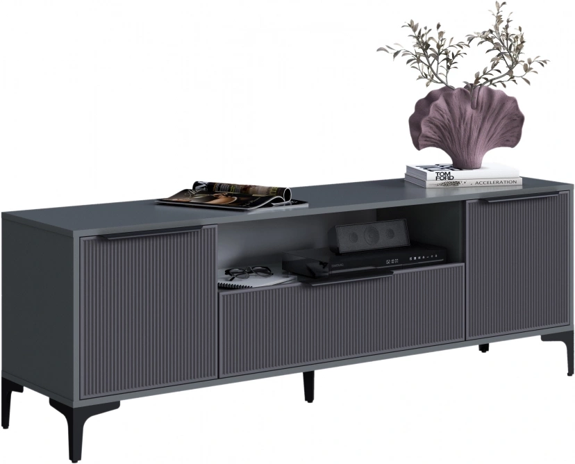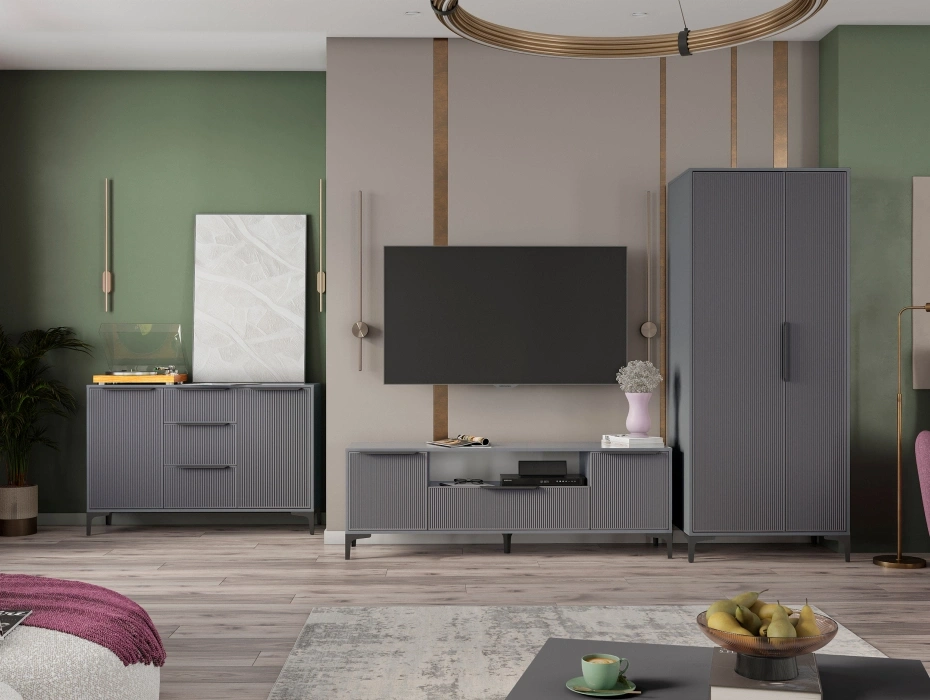 Вместительный шкаф (80,2 см в ширину, 54,3 см в глубину и 196 см в высоту) – настоящий хранитель порядка в доме. Просторный комод (128,9 см в ширину, 40,3 см в глубину и 84,7 см в высоту), идеально подходящий для хранения мелочей и аксессуаров. Завершающим элементом выступает ТВ-тумба (165 см в ширину, 40,3 см в глубину и 65,6 см в высоту) – достаточно просторная для размещения современной мультимедийной техники.