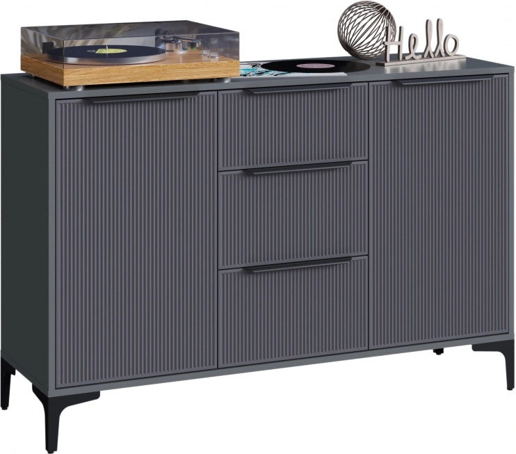 Вторым элементом комплекта является функциональный комод. Модель оснащена тремя удобными выдвижными ящиками и двумя дверцами, за которыми скрывается система из четырех полок. Такое решение позволяет оптимально организовать хранение как мелких предметов, так и более габаритных вещей.