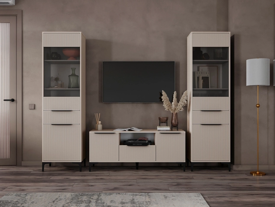 Модульная гостиная Иадама станет отличным решением для организации хранения и демонстрации предметов интерьера в просторной гостиной. Благодаря продуманной конструкции и качественным материалам, комплект прослужит долгие годы, сохраняя первоначальный внешний вид.