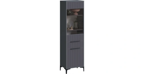 По бокам расположены два высоких шкафа размером 55 × 40,3 × 196 см. Шкаф-витрина с элегантной стеклянной верхней дверцей прекрасно подходит для демонстрации книг и декора, а шкаф-пенал обеспечивает дополнительное закрытое хранение. Оба шкафа оснащены выдвижными ящиками и удобными полками.