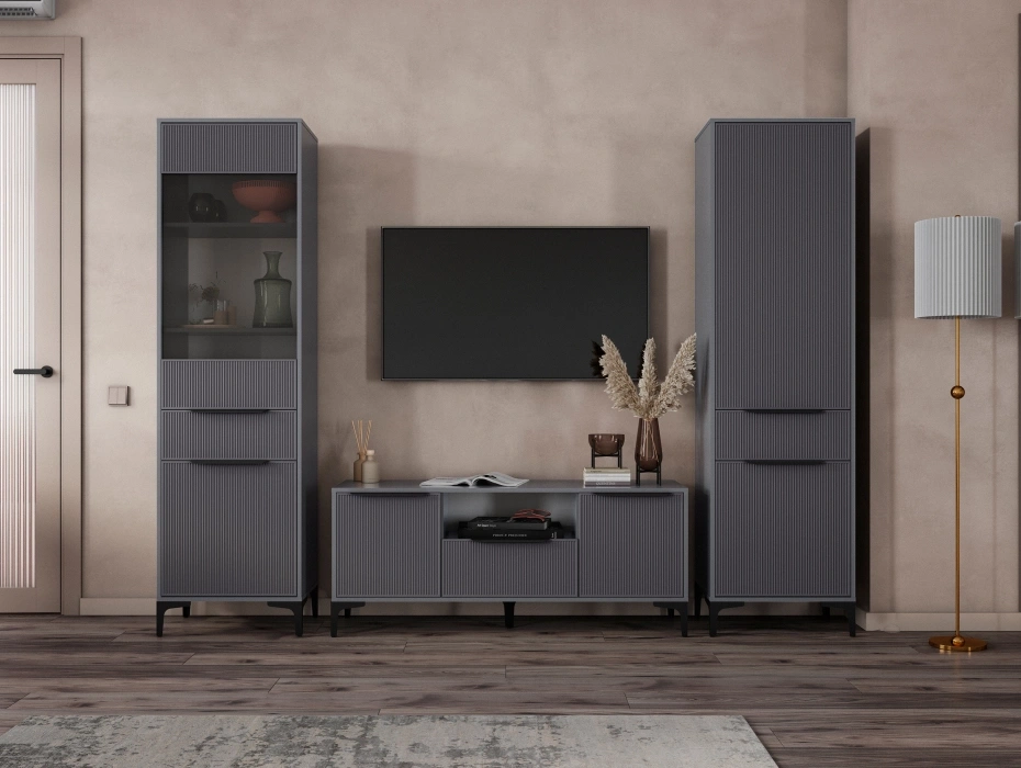Компактная и функциональная модульная гостиная Иадама в комплектации 5 – идеальное решение для современной небольшой гостиной. Комплект включает в себя ТВ-тумбу, шкаф-витрину и шкаф-пенал, которые гармонично сочетаются между собой.
