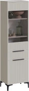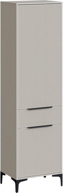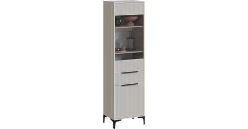 По бокам расположены два высоких шкафа размером 55 × 40,3 × 196 см. Шкаф-витрина с элегантной стеклянной верхней дверцей прекрасно подходит для демонстрации книг и декора, а шкаф-пенал обеспечивает дополнительное закрытое хранение. Оба шкафа оснащены выдвижными ящиками и удобными полками.