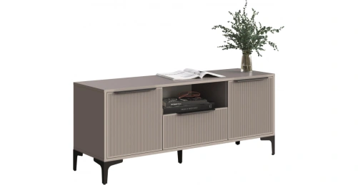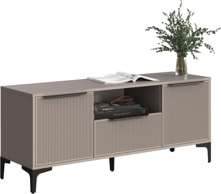 В центре композиции располагается ТВ-тумба размером 135 × 40,6 × 56,5 см. Её эргономичная конструкция включает пять полок (одна открытая), две распашные дверцы и выдвижной ящик для удобного размещения техники и хранения аксессуаров.