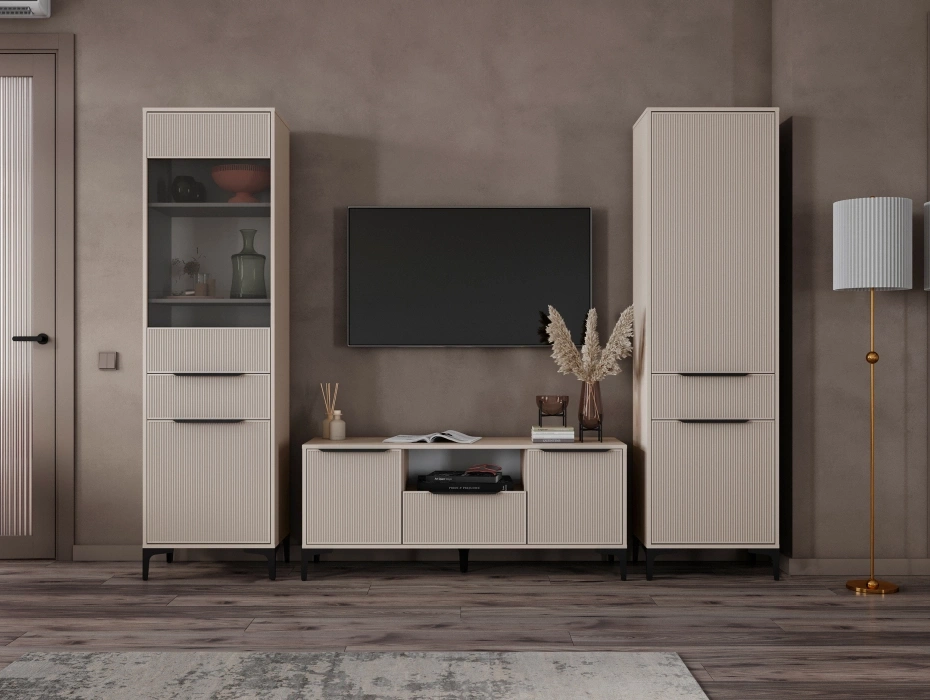 Компактная и функциональная модульная гостиная Иадама в комплектации 5 – идеальное решение для современной небольшой гостиной. Комплект включает в себя ТВ-тумбу, шкаф-витрину и шкаф-пенал, которые гармонично сочетаются между собой.