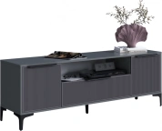 В центре композиции можно разместить вместительную ТВ-тумбу размером 165 × 40,3 × 65,6 см. Её продуманная организация включает пять полок (одна открытая), две распашные дверцы и удобный выдвижной ящик – всё для комфортного размещения техники и хранения аксессуаров.