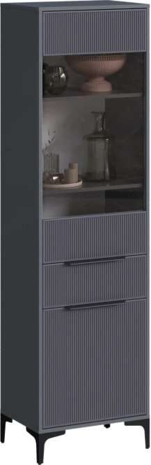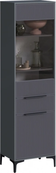 По бокам можно расположить два высоких шкафа-витрины размером 55 × 40,3 × 196 см. Их вертикальная конструкция не перегружает пространство, а вместительные полки отлично подходят для демонстрации книг и декора. В каждом шкафу есть выдвижной ящик для хранения мелочей.