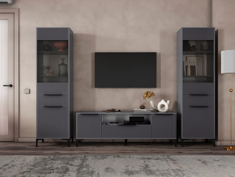 Стильная модульная гостиная Иадама в комплектации 7 – это идеальное решение для современной гостиной. Комплект включает просторную ТВ-тумбу и два элегантных шкафа-витрины, которые гармонично сочетаются между собой.