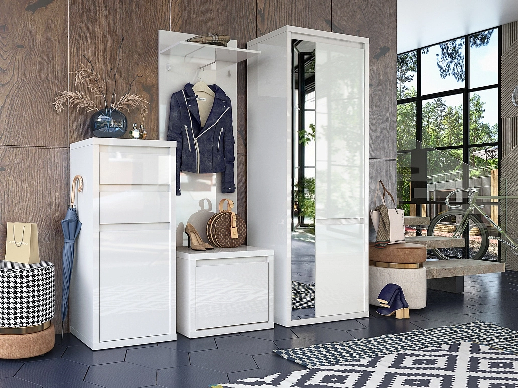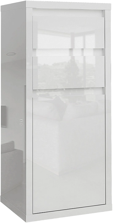 Фасады изготовлены из 16 мм ламинированной древесностружечной плиты производства компании «ЭГГЕР» - цвет «Белый». На лицевые поверхности корпуса нанесено высокоглянцевое лаковое покрытие. По периметру фасады закромлены кромкой ABS.