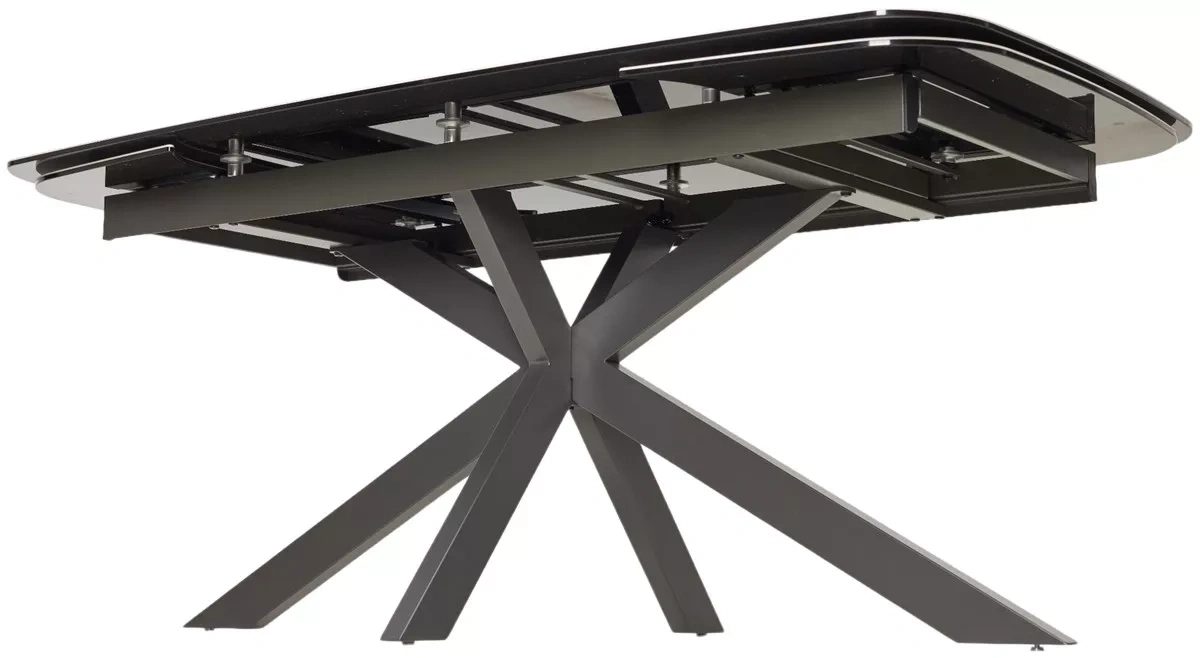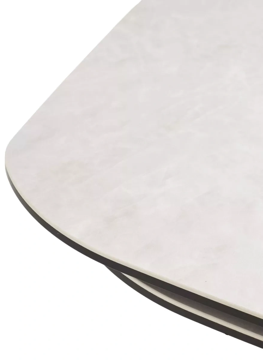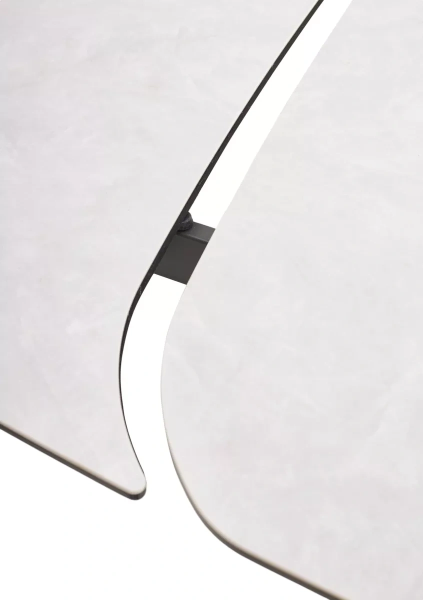 - двухсторонняя торцевая система раскладывания, две независимые вставки по краям по 40 см позволяют увеличить длину столешницы на 220 или 260 см при необходимости, испанская керамика, толщина столешницы 11 мм (3 мм керамика + 8 мм закаленное стекло), не впитывает загрязнения, термостойкая;
