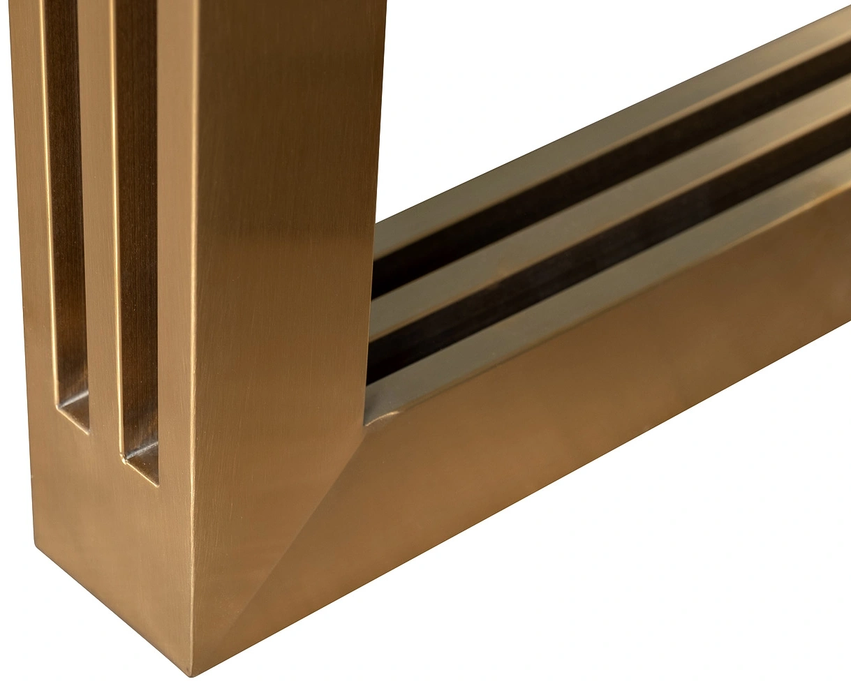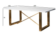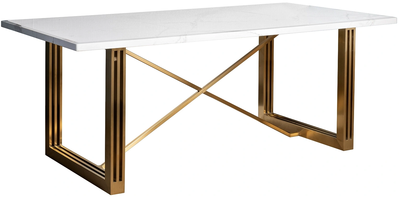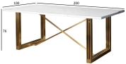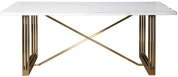 Обеденный стол с надежным основанием из золотой нержавеющей стали и имитирующей мрамор столешницы из МДФ. Обеденный прямоугольный стол прекрасно дополнит интерьер современной кухни, внесет нотку изысканности и красоты в обстановку столовой. Оригинальное основание из «золотой» брашированной нержавеющей стали обеспечивает устойчивость всей конструкции и подчеркивает эстетику мебели. Обеденный стол в современном стиле смотрится дорого и презентабельно, органично вписывается в обстановку ар-деко, шебби-шик, модерн, фьюжн. Толщина столешницы - 36мм, в зависимости от освещения тон мрамора может казаться сероватым, от партии к партии оттенок может незначительно отличаться.