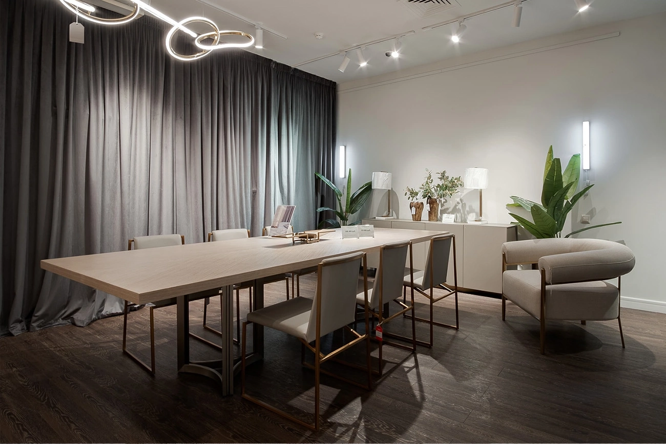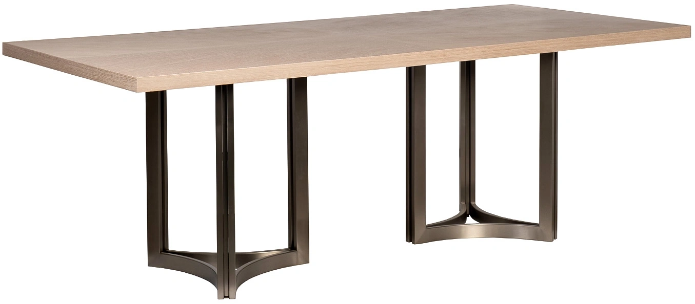 Прямоугольный обеденный стол воплощает последние тренды интерьерной моды – практичность, натуральность материалов, лаконичность дизайна. В конструкции гармонично сочетаются благородная фактура дерева и изысканный блеск нержавеющей стали. Вместо традиционных ножек столешница установлена на металлические опоры, за счет чего большой обеденный стол выглядит дорого и аристократично. Мебель отличают превосходное качество, премиальные материалы, ультрамодный дизайн. На нашем сайте можно купить обеденный стол вместе с креслами или стульями аналогичного дизайна.Просьба обратить внимание, что при перемещении стол следует держать только за основание, а не столешницу! Иначе столешница может потрескаться.