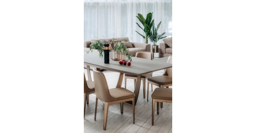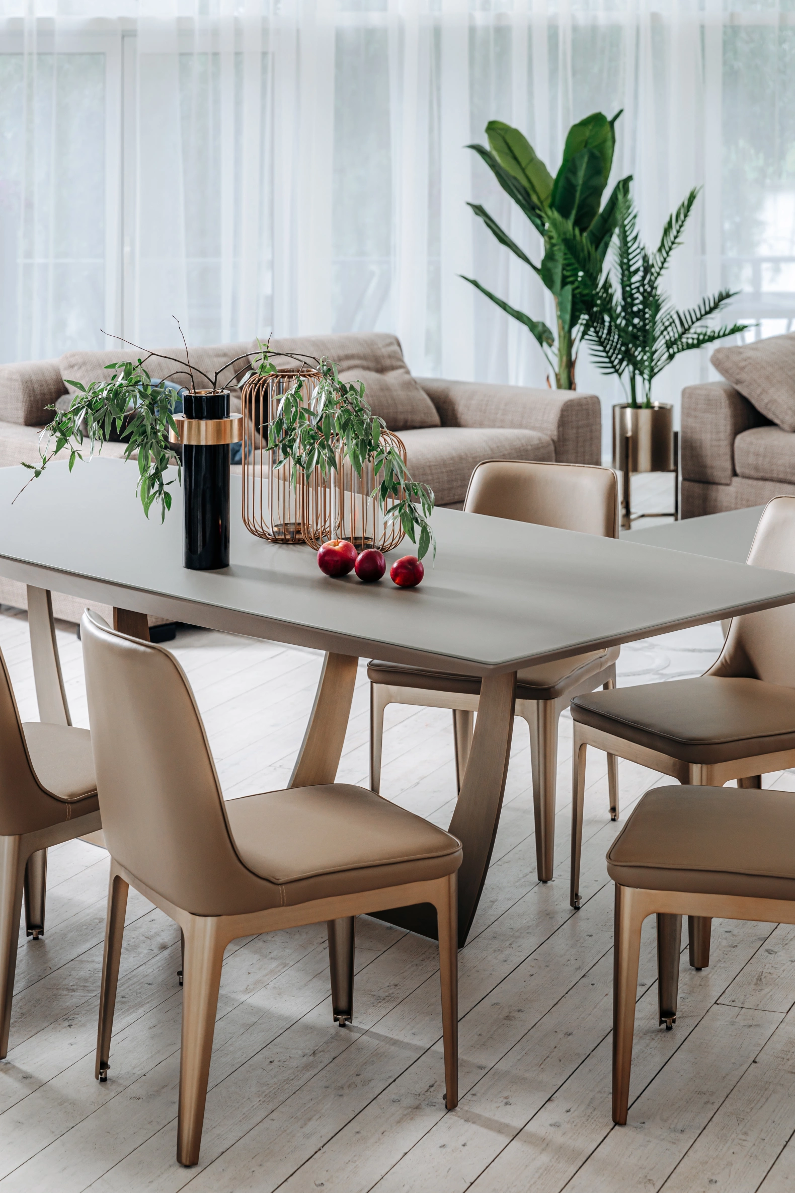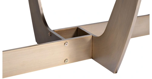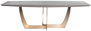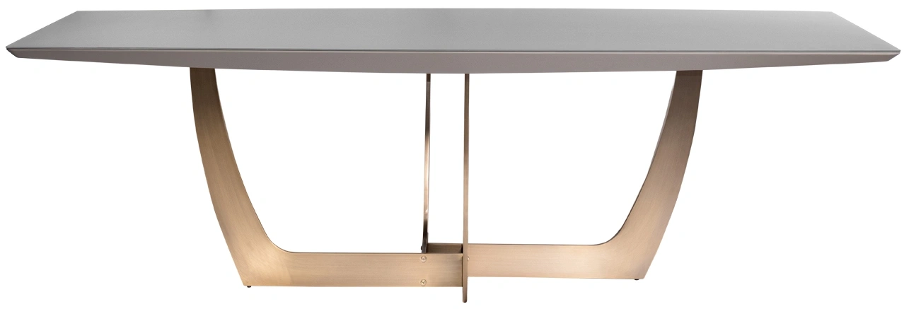Большой суперсовременный обеденный стол из мебельной коллекции Space от ведущего бельгийского дизайнера Тома Де Вульфа воплощает последние тенденции европейской интерьерной моды. Столешница из серого МДФ покрыта закаленным 5мм стеклом, обработанным по уникальной технологии, в результате которой поверхность приобретает гладкую и бархатистую фактуру, будто обкатанную морем. Оригинальная фигурная опора медного цвета заменяет традиционные ножки, обеспечивая устойчивость и безопасность конструкции. Все части стола выполнены из исключительно качественных материалов по самым современным технологиям.