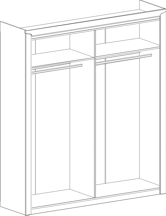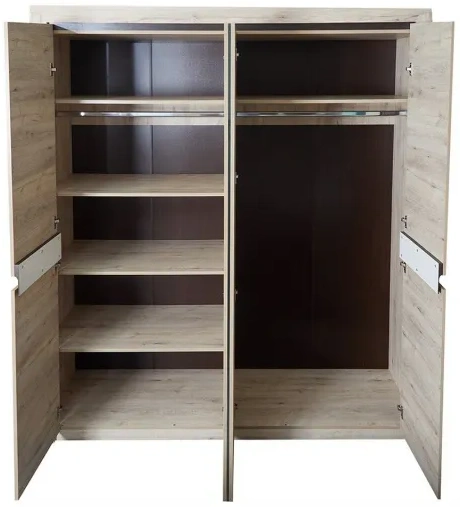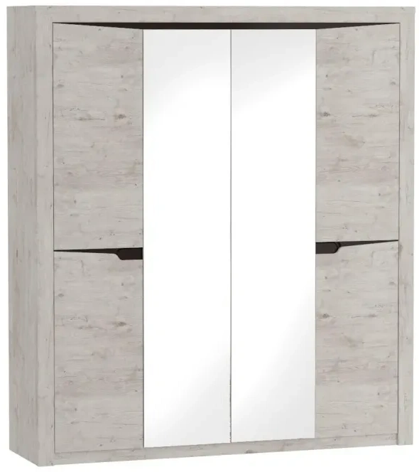 Четырёхдверный шкаф "Соренто" с зеркалом отлично подойдёт для спальни или прихожей и станет прекрасным дополнением к вашему интерьеру. На боковых дверях имеются декоративные вырезы, выполняющие функцию ручек. Одно из отделений шкафа можно изменить комплектом из трёх полок (приобретается отдельно)