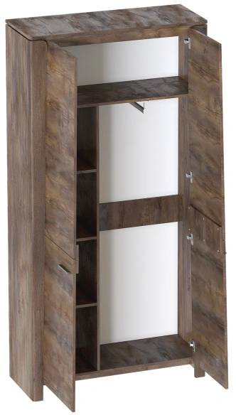 Внутреннее пространство шкафа разделено полкой на платяное с продольной стальной штангой и верхнее отделение для хранения белья. Фасады выполнены из МДФ, преимуществами данного материала являются влагостойкость, экологичность, гипоаллергенность, надёжность и долгий срок эксплуатации.