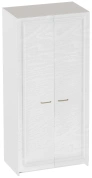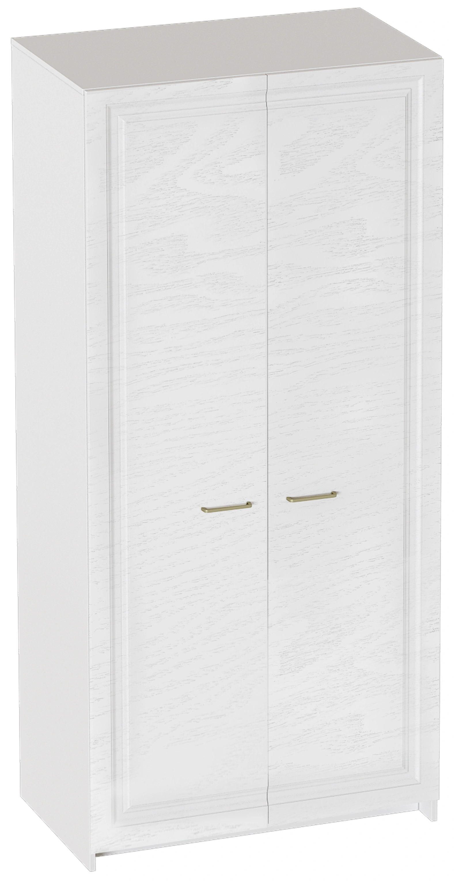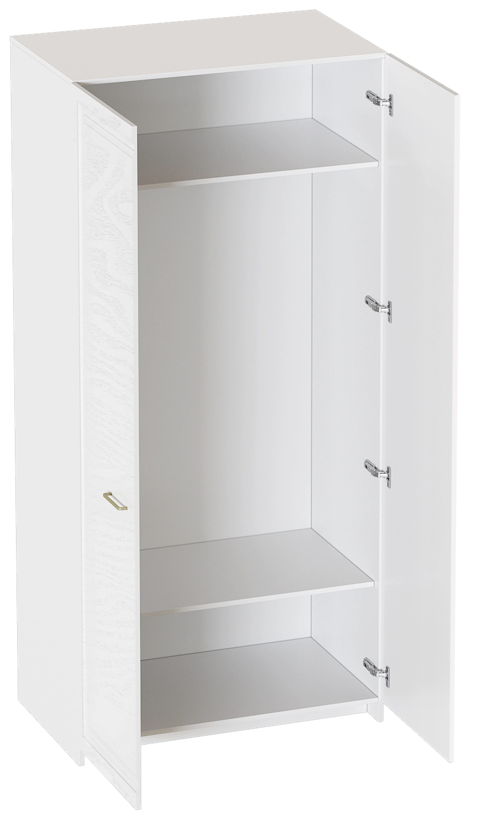 Шкаф выполнен в цвете Айс 06 / Белый Аляска. Классическая фрезеровка фасадов и ручки-скобы из брашированного золота придают изделию особый шарм и элегантность. Внутреннее пространство шкафа разделено натри секции. Верхняя секция шкафа отделена жёсткой полкой. В средней секции под жёсткой полкой расположена овальная штанга. Нижняя секция отделена от средней съемной полкой. Двери оснащены петлями с амортизаторами.
