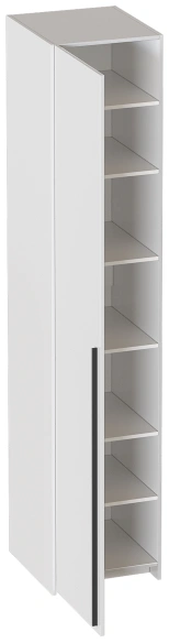 Конструкция шкафа состоит из двух боковых стенок, между которыми расположены стационарная полка, пять съемных полок и цокольная коробка. Шкаф оснащен накладными петлями с амортизатором.