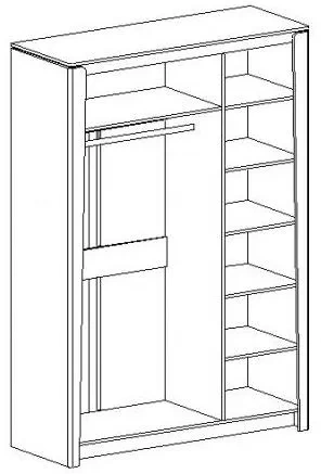 Внутреннее пространство шкафа разделено на два отделения: слева находится платяное отделение с одной стационарной полкой и продольной стальной штангой, справа расположено отделение для хранения белья с четырьмя съёмными полками и одной стационарной.