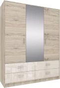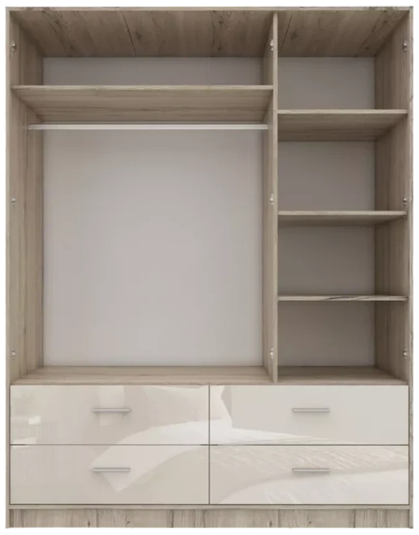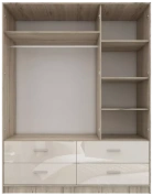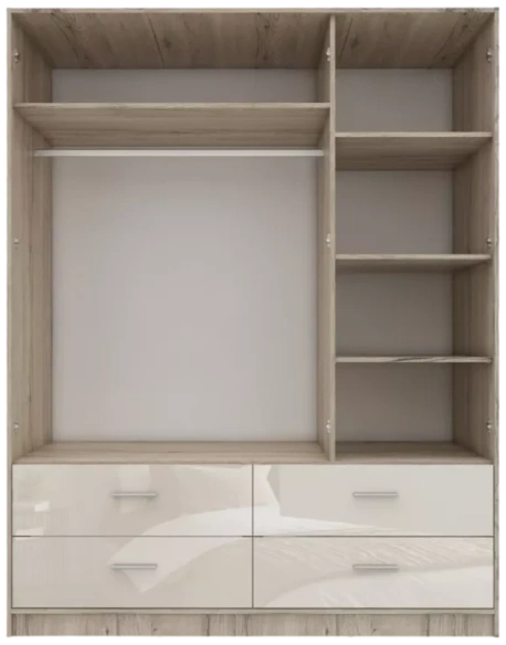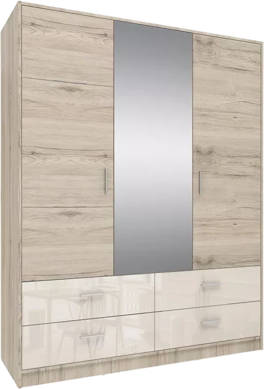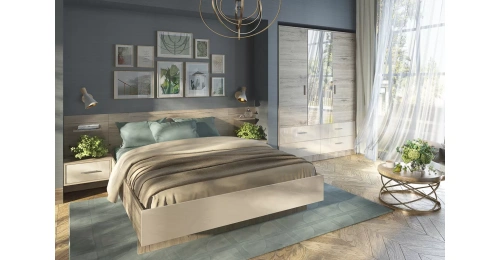Корпус спальни изготовлен из 16 мм ламинированной древесностружечной плиты цвет –«Дуб Санремо» и «Крем Бежевый». Торцевые поверхности корпуса закромлены кромками ПВХ и ABS. Фасады изготовлены из 16 мм ламинированной древесностружечной плиты цвет –«Дуб Санремо» и «Крем Бежевый». По периметру фасады закромлены кромками ПВХ и ABS. Детали, изготовленные из древесностружечной плиты цвет – «Крем Бежевый», обработаны на лаконаливных машинах имеют высоко глянцевую поверхность .