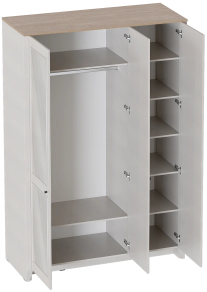 УФ-фотопечать полосок на фасадах в обрамлении пластиковых молдингов придает изделию оригинальный стиль современной классики. В центральной части шкафа расположена штанга для одежды, а также верхняя и нижняя полки, каждая из которых разделена на два отделения. Правая и левая части шкафа имеют по пять полок высотой 332 мм каждая. Задняя стенка шкафа изготовлена из ХДФ. На опорах размещены войлочные подпятники. Высота опор 104 мм. Зеркало выполнено с фацетом.
