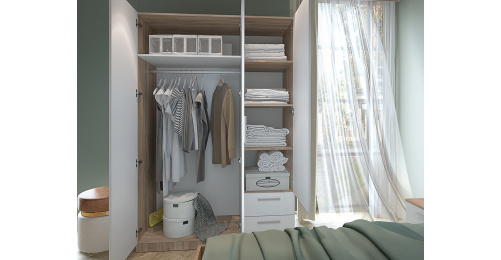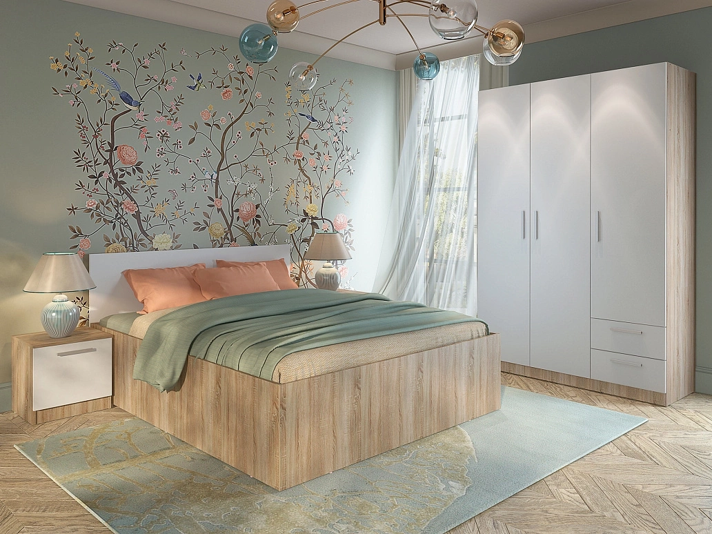 Корпус спальни изготовлен из 16 мм ламинированной древесностружечной плиты цвет –«Белый» и «Дуб Сонома». Торцевые поверхности корпуса закромлены кромками полипропилен. Фасады изготовлены из 16 мм ламинированной древесностружечной плиты цвет –«Белый» и «Дуб Сонома».