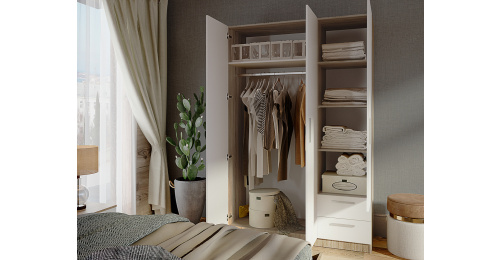 Корпус спальни изготовлен из 16 мм ламинированной древесностружечной плиты цвет –«Белый» и «Дуб Сонома». Торцевые поверхности корпуса закромлены кромками полипропилен. Фасады изготовлены из 16 мм ламинированной древесностружечной плиты цвет –«Белый» и «Дуб Сонома».