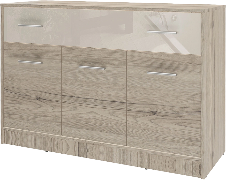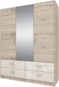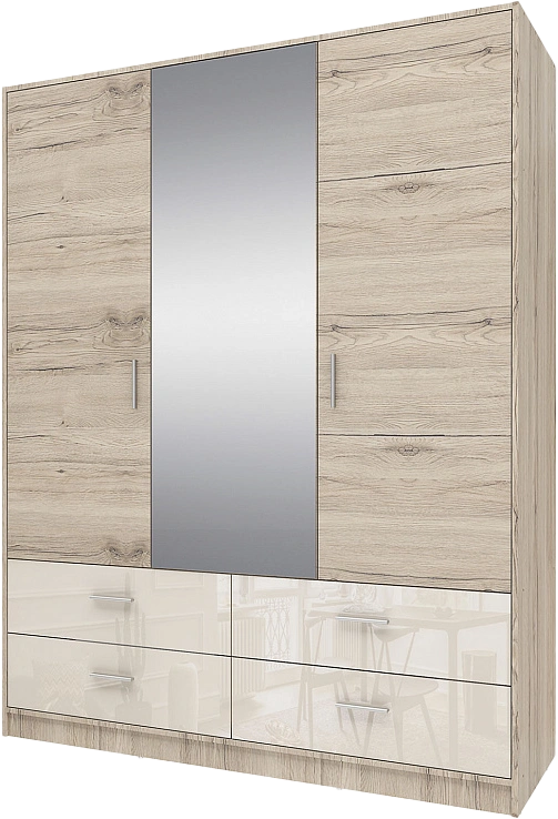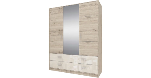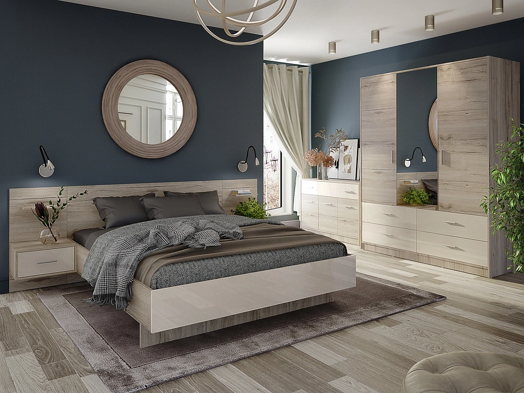 Корпус спальни изготовлен из 16 мм ламинированной древесностружечной плиты цвет –«Дуб Санремо» и «Крем Бежевый». Торцевые поверхности корпуса закромлены кромками ПВХ и ABS. Фасады изготовлены из 16 мм ламинированной древесностружечной плиты цвет –«Дуб Санремо» и «Крем Бежевый». По периметру фасады закромлены кромками ПВХ и ABS. Детали, изготовленные из древесностружечной плиты цвет – «Крем Бежевый», обработаны на лаконаливных машинах имеют высоко глянцевую поверхность .
