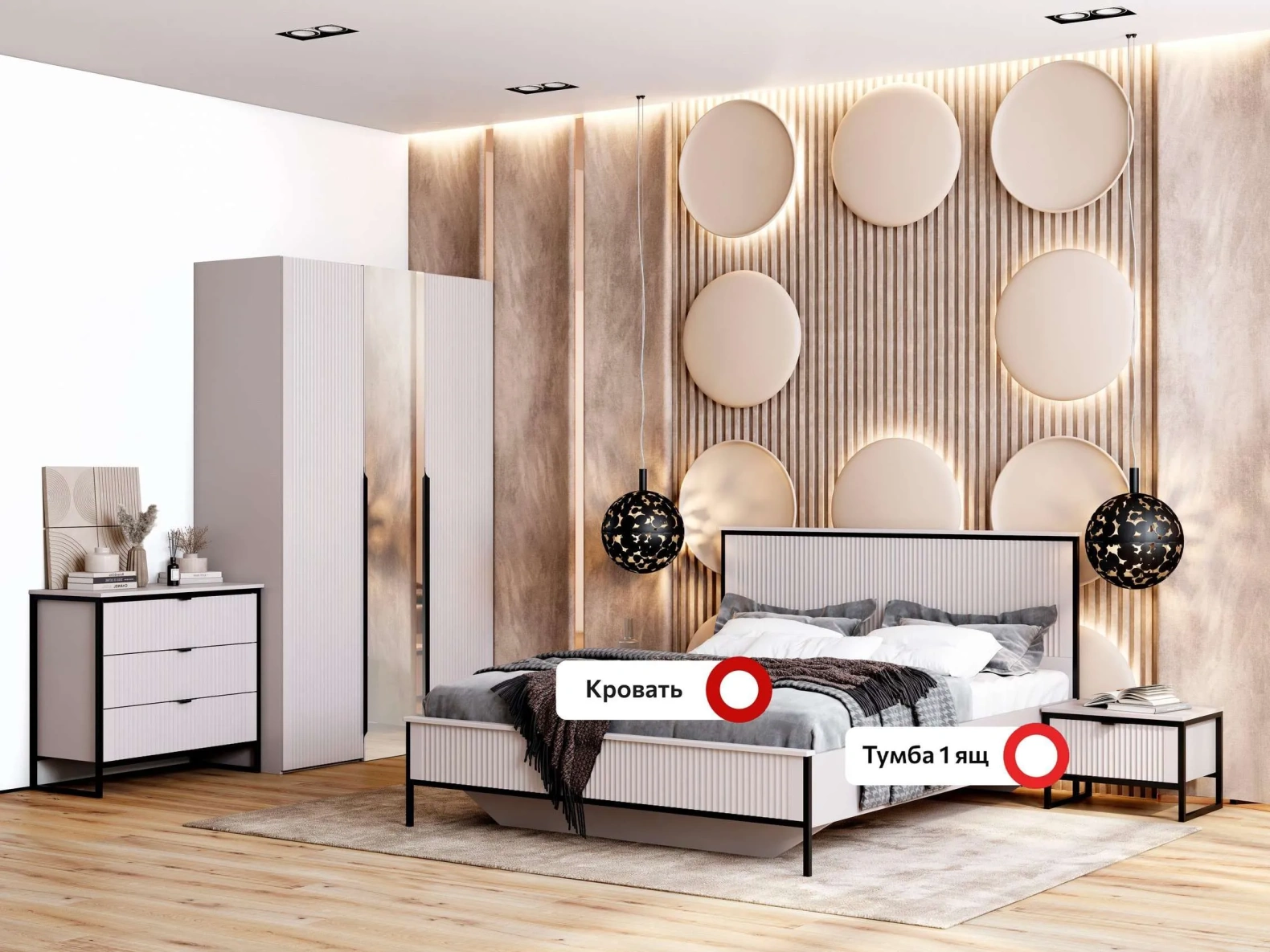 Гарнитур подходит как для просторных, так и для небольших спален, помогая эффективно использовать пространство и создавать уютное место для отдыха и сна.