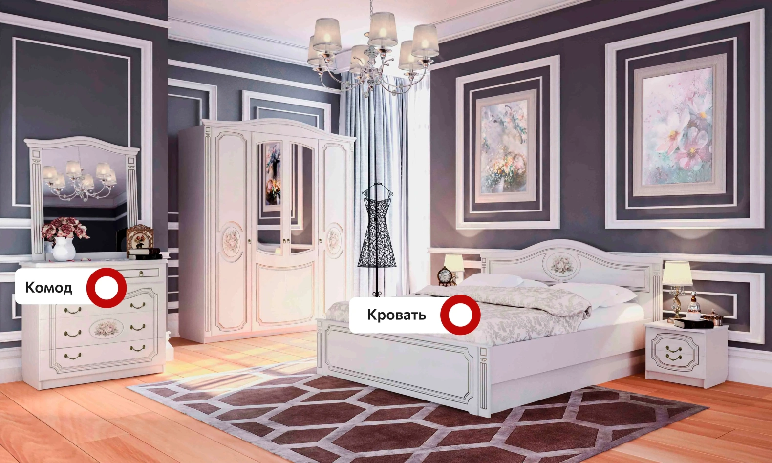 Фасады мебели декорированы элегантной фрезеровкой с эффектом патины и медальоном, на котором изображены розы. Для удобства использования ящики оснащены темными металлическими ручками, имитирующими ковку.