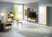Корпус стеллажа выполнен из ЛДСП цвета натурального дерева, высокие стильные опоры и ручки - из массива березы. Стеллаж прекрасно сочетается с шкафом-витриной Калгари и ТВ тумбой. Прекрасно будет смотреться как в гостиной, так и в детской комнате или спальне.