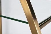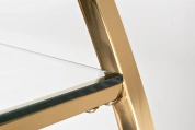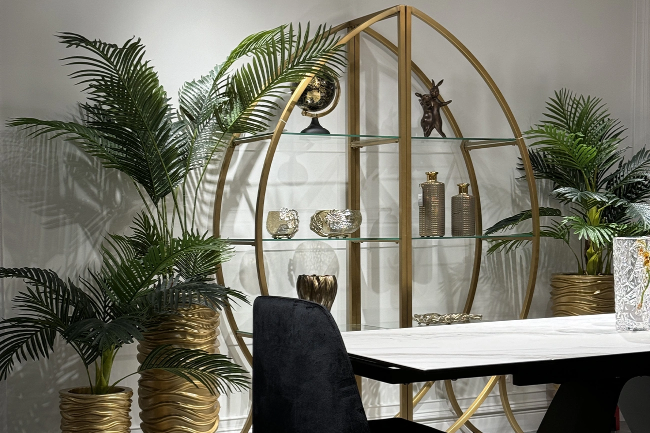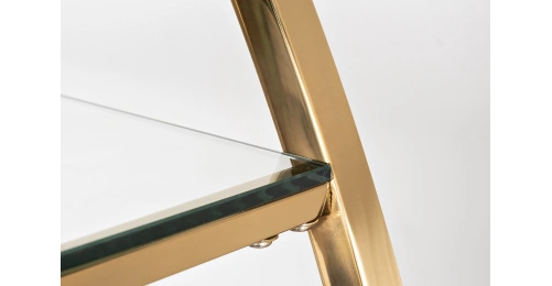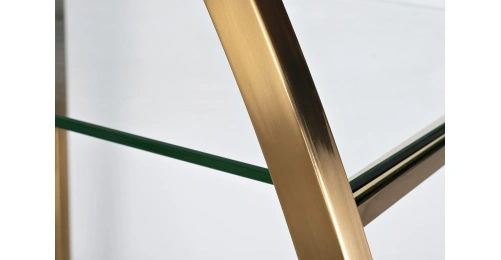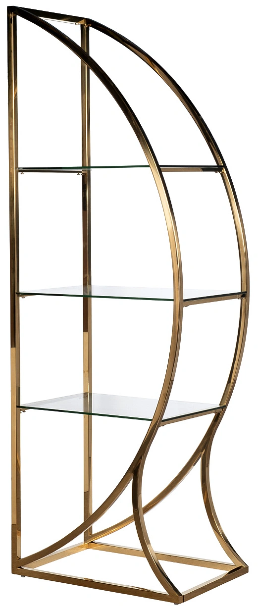 Дизайнерский стеллаж в гостиную "ПОЛУСФЕРА" сочетает в себе креативный стиль и функциональность. Он прекрасно справится с хранением сувениров, посуды, книг, статуэток и прочего домашнего декора. Стеклянные полки станут идеальным местом для ваз, кашпо, фоторамок, шкатулок, памятных вещей. Стильный стеллаж из стали золотого цвета необычной формы украсит интерьер гостиной, спальни, столовой, рабочего кабинета. За счет тандема блестящей стали и прозрачного стекла он добавит обстановке изящества и не перегрузит интерьер. Купить стеллаж с полками можно для украшения дома или квартиры в современном стиле. Он легко сочетается с мебелью в стиле ар-деко, неоклассики, контемпорари.