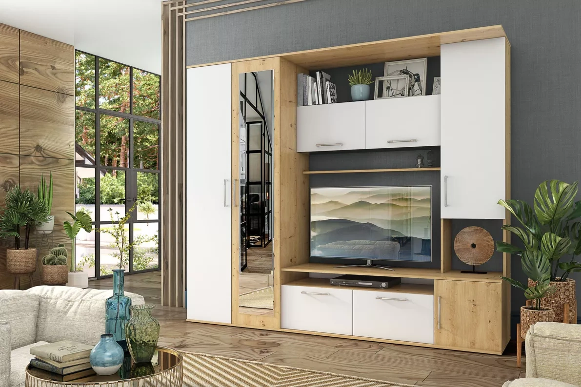 Гостиная Алегро - стенка, которая прекрасно дополнит ваш интерьер. Она предлагает множество мест для хранения вещей, витрину для книг и украшений, а также удобное место для размещения телевизора. Размеры стенки составляют 2340 x 2000 x 515 мм, материал корпуса выполнен из прочного ЛДСП. Фасады также выполнены из ЛДСП и украшены зеркалом. Цвет фасада - Дуб дикий / Белый, а корпуса - Дуб дикий. Место под ТВ имеет размеры 70 х 100 см. В шкафной секции предусмотрена удобная штанга для одежды. Гостиная Алегро не только привлекательна внешним видом и стильным дизайном, но и функциональна, позволяет рационально использовать пространство в вашем доме.