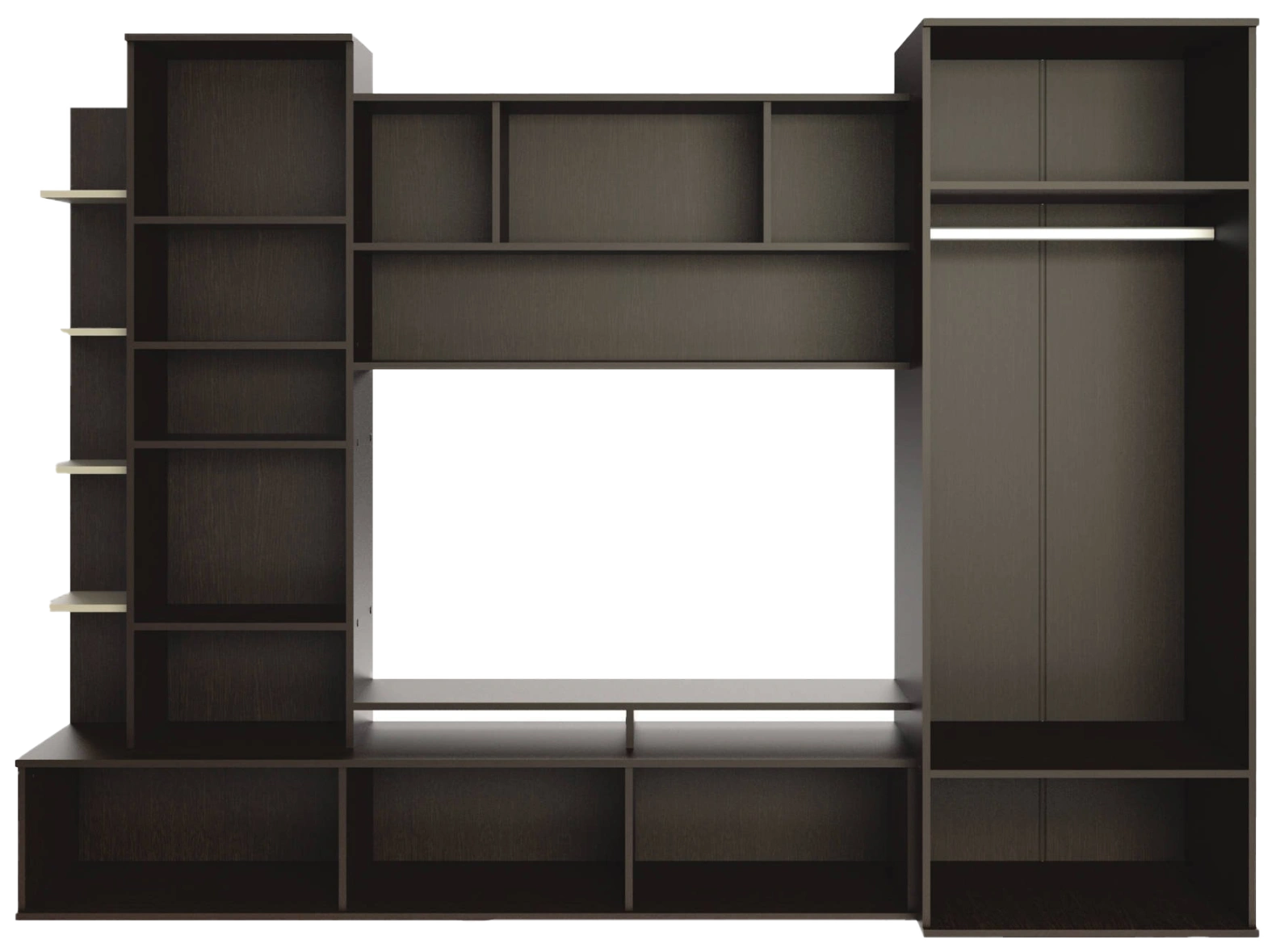 Гарнитур включает широкий платяной шкаф с тремя отсеками, большую подвесную полку, 5 ящиков с дверцами и множество небольших открытых полочек для книг, сувениров и других аксессуаров. Все элементы образуют по центру нишу под ТВ шириной 117 см и высотой 70 см, в которую поместиться телевизор диагональю до 54 дюймов. Подвижные части стенки надежны и долговечны – дверцы со временем не расшатываются и плотно закрываются в течение всего срока эксплуатации.