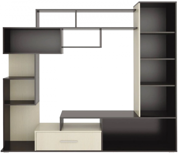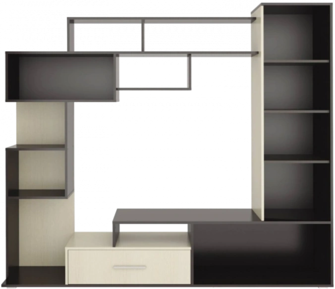 Диско – корпусная мебель, выполненная в оригинальном ассиметричном дизайне, который придется по душе ценителям стиля “модерн”. Вместительные полки, идущие уступами, смотрятся оригинально и могут разнообразить интерьер не только гостиной, но и спальни или детской комнаты. Наличие широкого шкафа и ящиков (выдвижных и с дверцами) делает комплект более функциональным – в них можно хранить постельное белье, игрушки и другие необходимые вещи, а высота в 181 см позволит дотянуться до полок даже ребенку.