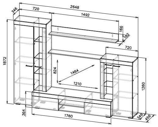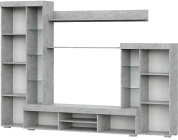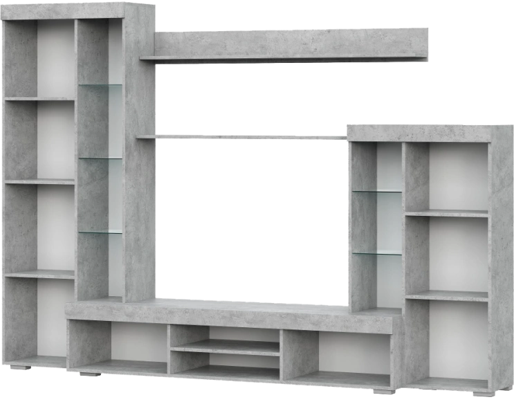 Готовая гостиная Swede, изготовленная из ЛДСП, является интересным и функциональным решением для обустройства гостиной. Она имеет большую нишу под ТВ размером 121 * 82 см, что позволяет разместить телевизор до 47 дюймов. Два закрытых шкафа расположены по обе стороны ниши. Левый шкаф содержит 4 полки внутри, а также 3 стеклянные полки снаружи. Правый шкаф имеет 2 закрытых полки внутри и 2 стеклянные полки. Над нишей расположены две открытые длинные полки, а под ней - 2 закрытых шкафчика и 2 открытые полки.
