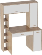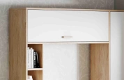 Внутреннее пространство разделено на 3 закрытых зоны: правая зона оснащена 1 съемной и 3 жесткими полками. Левая зона представлена в виде открытой ниши с полками. Верхнее отделение разделено на 2 части перегородкой. Под столешницей расположен ящик на шариковых направляющих.