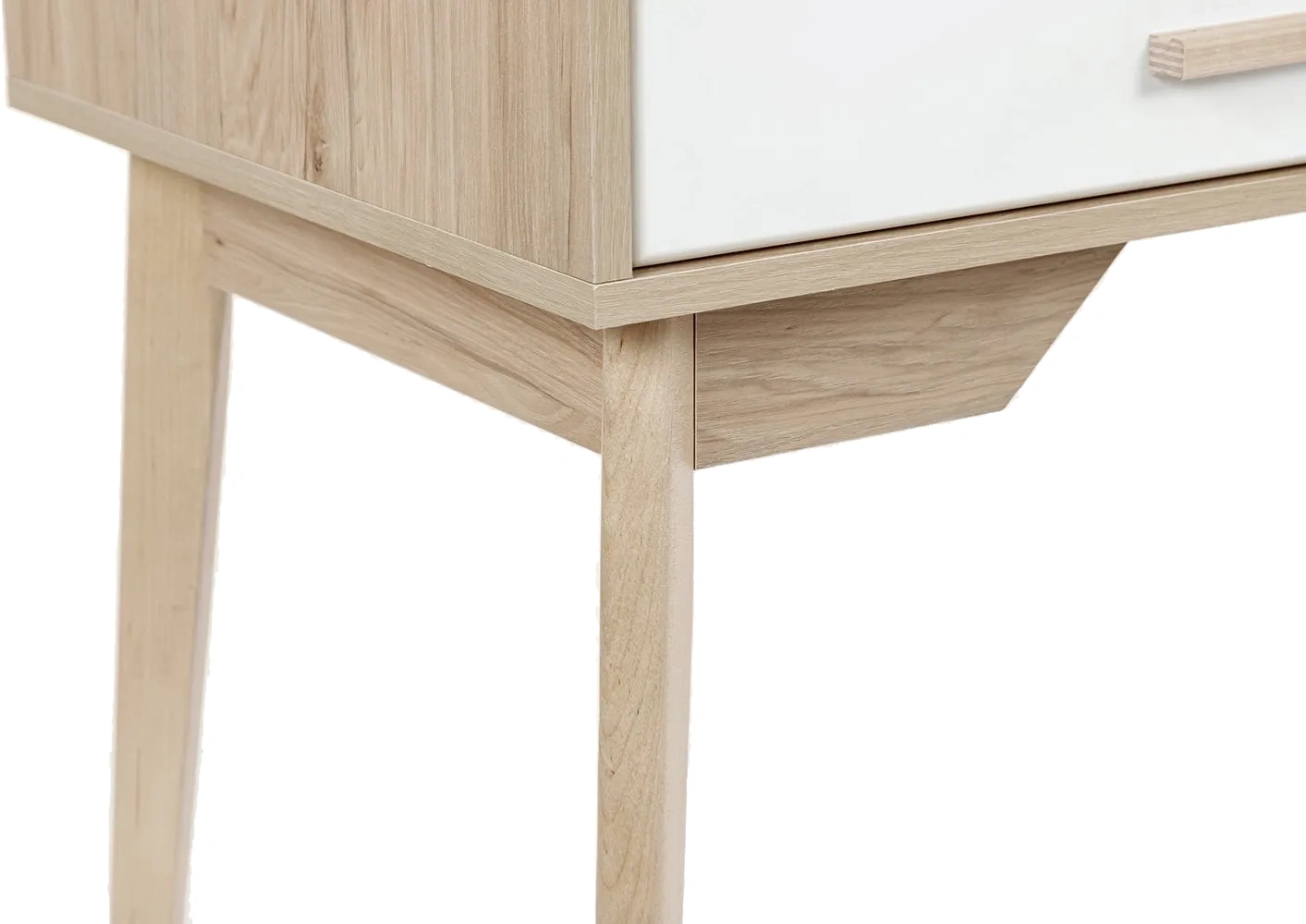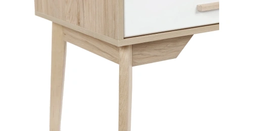 Столешница и корпус изделия выполнены из ЛДСП цвета натурального дуба, фасады ящиков - из МДФ, ручки - массив березы.