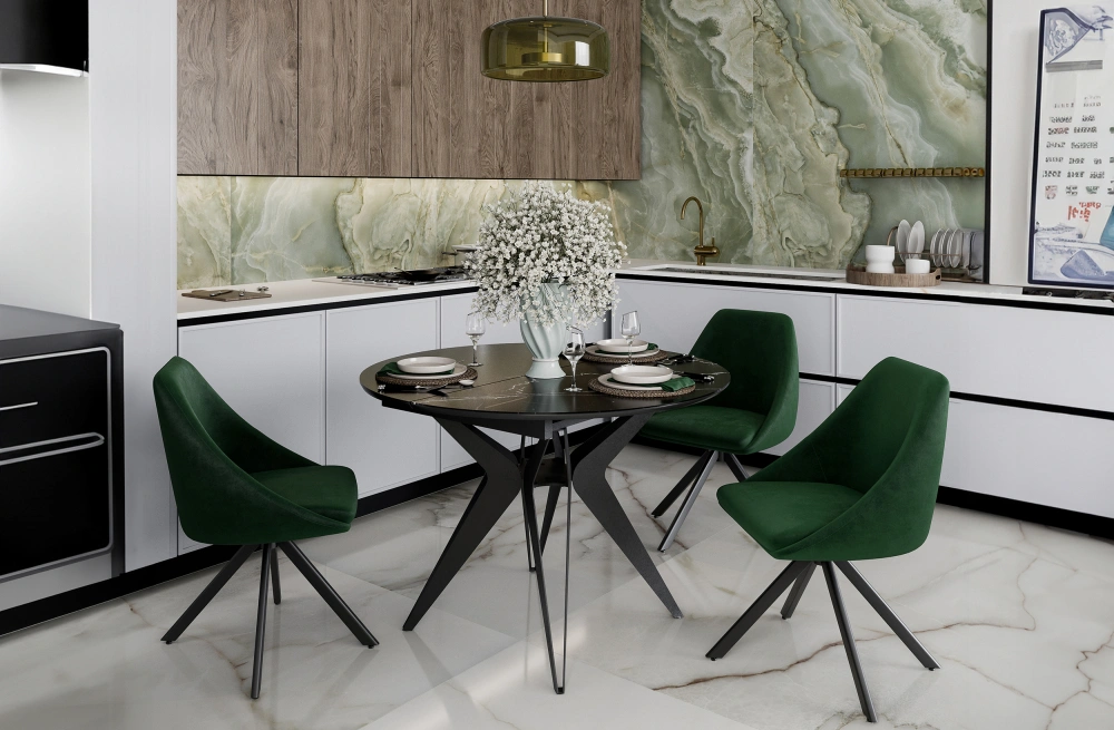 Материал каркаса - Металл; Материал сиденья - Велюр; Материал ножек - Металл; Материал обивки - Велюр; Цвет каркаса - Черный; Цвет сиденья - Зеленый; Цвет ножек - Черный; Цвет обивки - Зеленый; Ширина - 51; Глубина - 55; Высота - 83; Ширина сиденья - 40; Глубина сиденья - 43; Высота сиденья - 47;