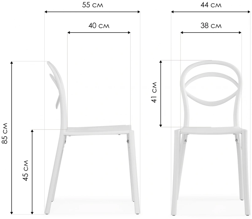 Материал каркаса - Пластик; Материал сиденья - Пластик; Материал ножек - Пластик; Цвет каркаса - Белый; Цвет сиденья - Белый; Цвет ножек - Белый; Ширина - 44; Глубина - 55; Высота - 85; Ширина сиденья - 38; Глубина сиденья - 40; Высота сиденья - 45;