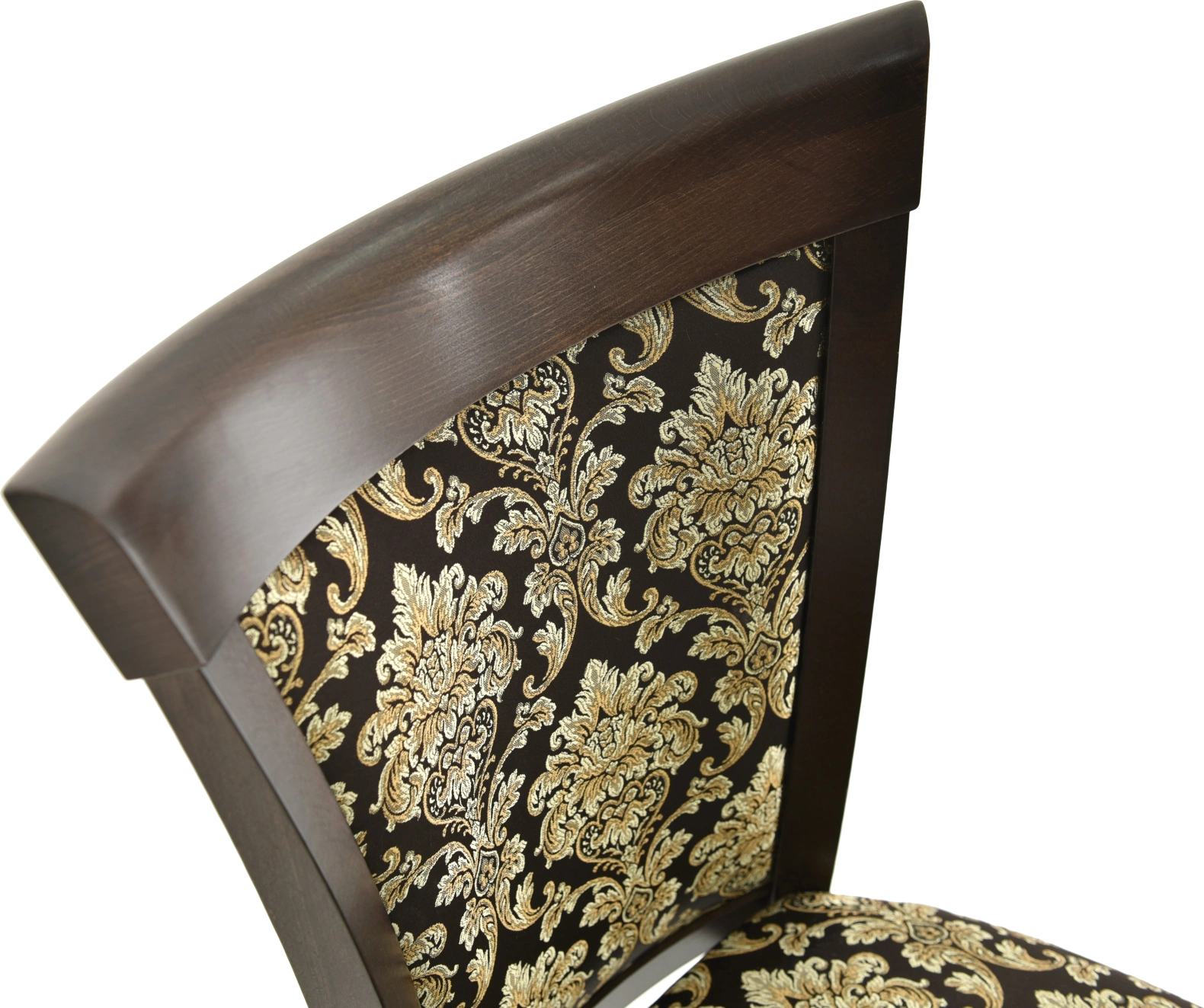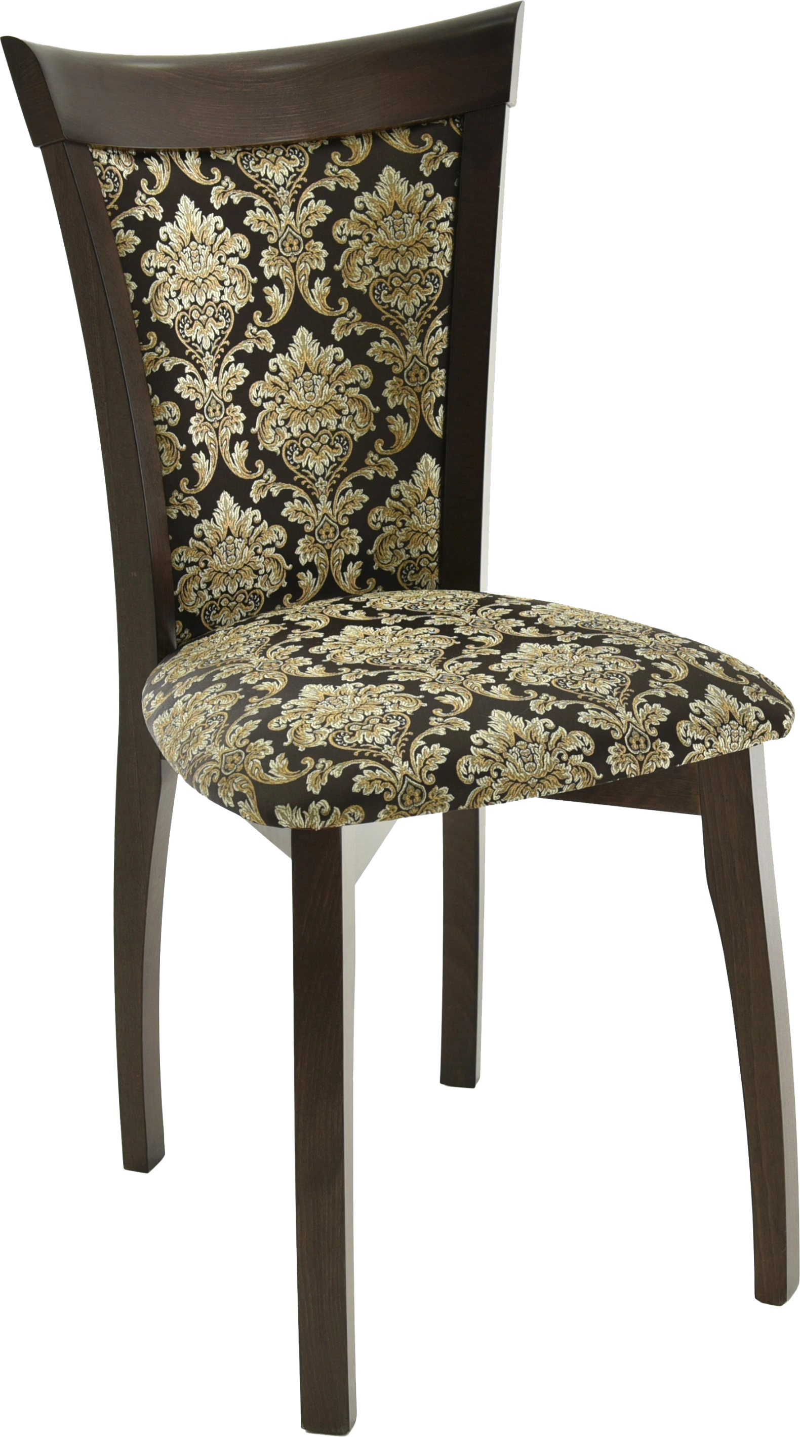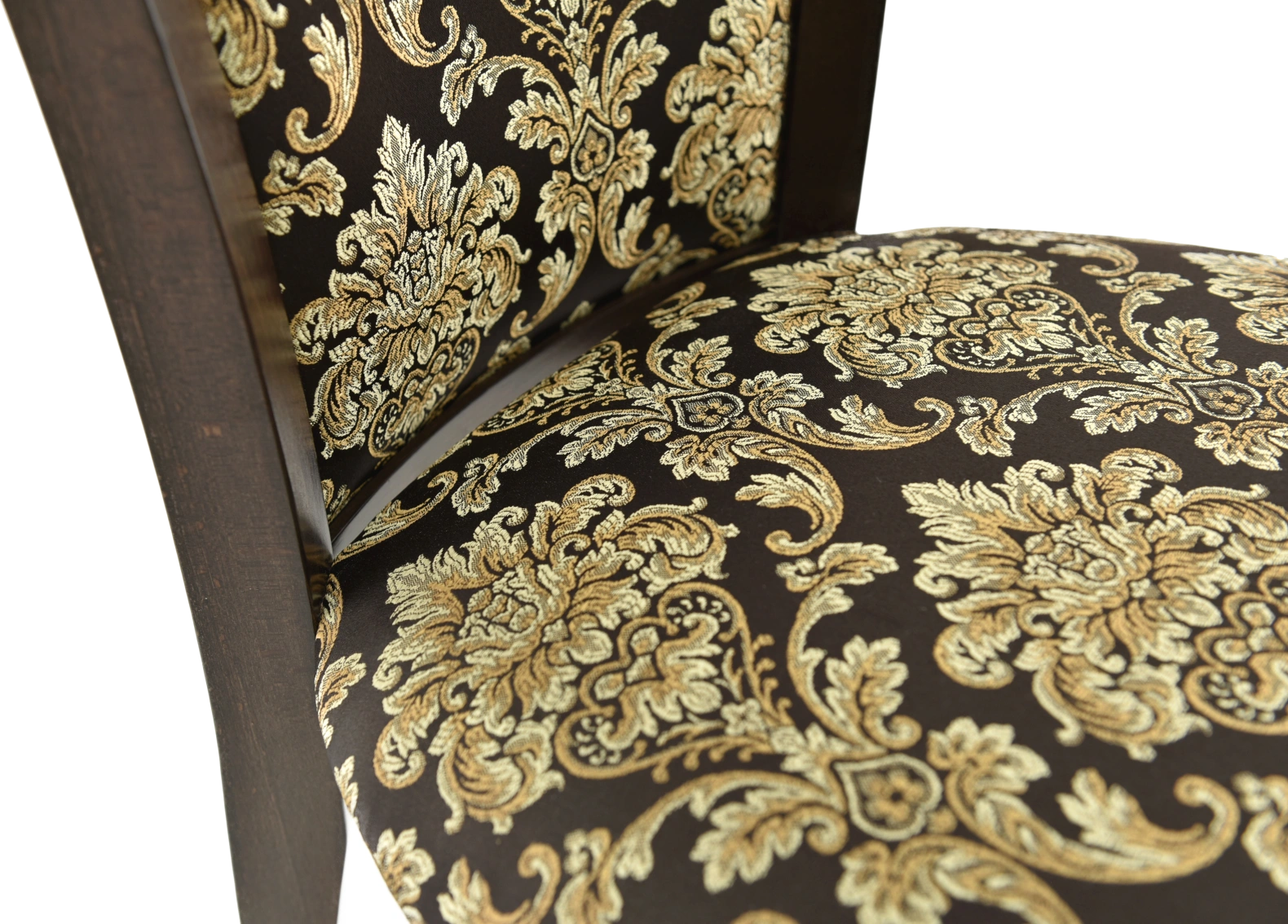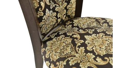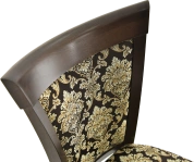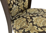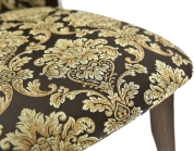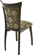 Деревянный стул «Тулон» с мягкой спинкой, в крашении Тон 7 (Темный орех), ткань Андрис вензель 101-2. Материал изготовления каркаса стула: массив березы с окраской различных тонов, в том числе и в сочетании с патиной (искусственно состаренное покрытие дерева). Варианты модели стула предусматривают изготовление из различных тканей: шелка, экокожи и рогожки, а так же с жестким сиденьем.