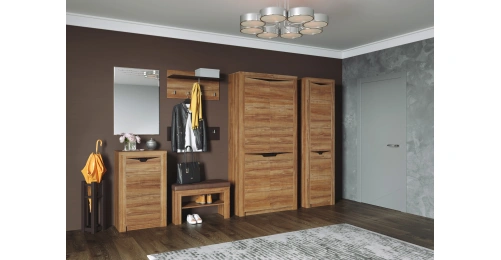 Тумба имеет распашную дверцу, за которой скрывается достаточно места для хранения обуви, а выдвижной ящик идеально подходит для хранения мелких предметов, таких как ключи, перчатки и шапки. Для открывания двери внутри устанавливается система Push to open открывающая ее после нажатия. На открытой полке можно разместить аксессуары или декор, чтобы добавить индивидуальности прихожей.