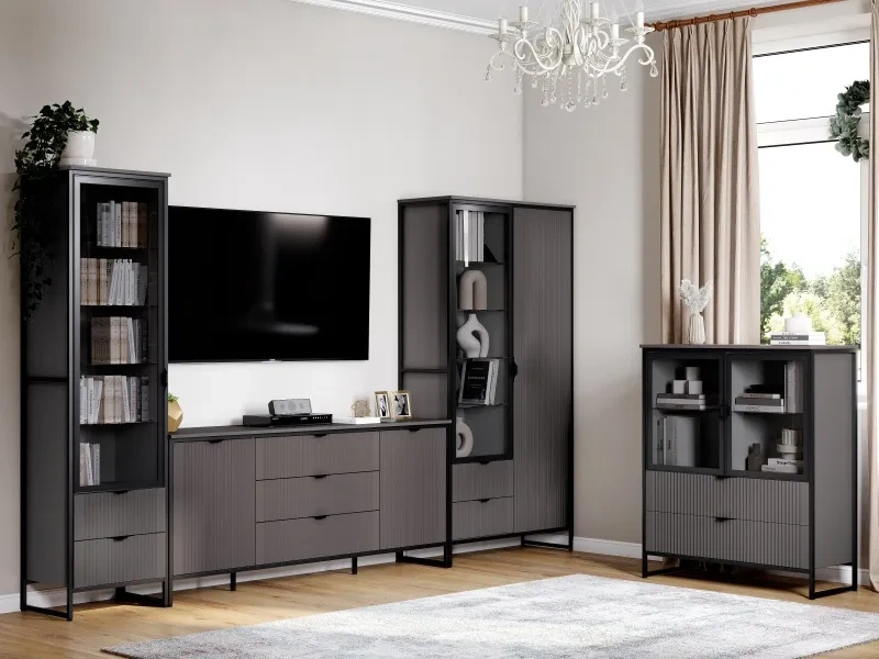 Коллекцию модульной гостиной "Нора" отличает современный оригинальный стиль. Декоративная продольная фрезеровка на фасадах из МДФ и опоры на металлокаркасе цвета соответствуют модным тенденциям этого года в ведущих зарубежных коллекциях.