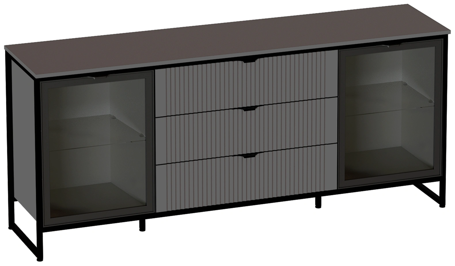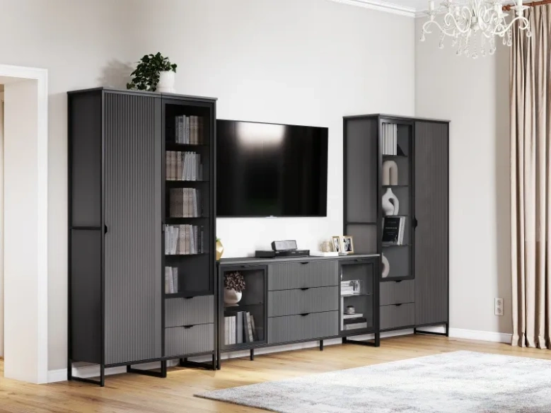 Коллекцию модульной гостиной "Нора" отличает современный оригинальный стиль. Декоративная продольная фрезеровка на фасадах из МДФ и опоры на металлокаркасе цвета соответствуют модным тенденциям этого года в ведущих зарубежных коллекциях.