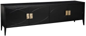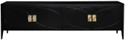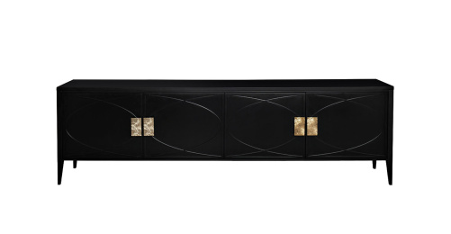 Дизайнерская ТВ-тумба в стиле ар-деко - авторская разработка студии Garda Decor. Черный матовый фасад украшен объемным дугообразным декором и широкими рельефными ручками золотого цвета (глянцевое золото). Четыре распашные дверцы открывают доступ к вместительным отделениям с полкой и ящика прекрасно подойдут для хранения столового белья, книг или посуды. Тонкие ножки придают конструкции легкость и изящество. На просторной столешнице можно установить телевизор практически любой диагонали, оборудование для домашнего кинотеатра или аудиосистему.