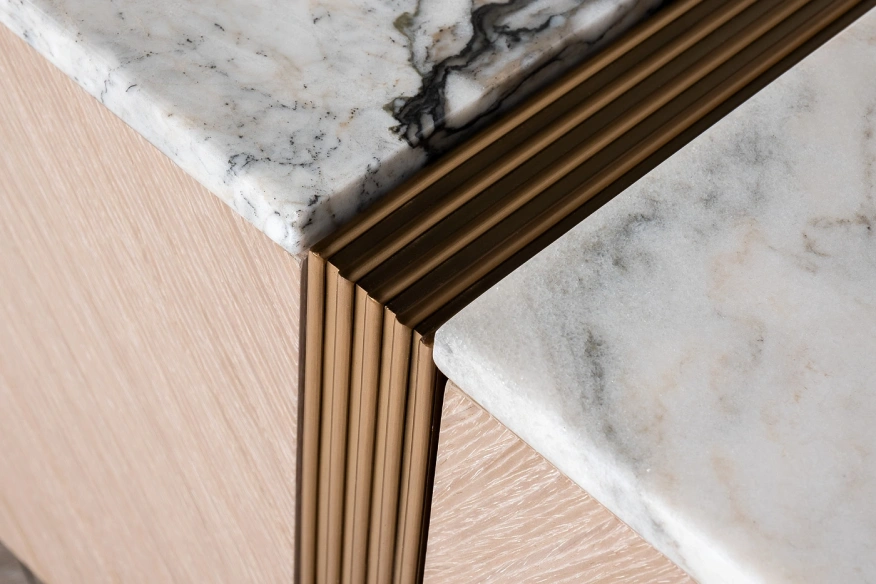 Длинная тумба под телевизор – универсальное решение для современной гостиной или спальни. Данная мебель позволяет организовать функциональную ТВ-зону и удобное хранение домашних вещей. Мраморная столешница тумбы прекрасно справляется с функцией подставки под телевизор и декор. Благодаря светлому оттенку шпона стильная тумба под ТВ прекрасно комбинируется с современной мебелью. Особенность данной модели – металлические опоры, одновременно являющиеся частью фасада. Купить тумбу под телевизор можно с доставкой по РФ, а также дополнить ее любой другой мебелью и декором в модной стилистике ар-деко.Столешница вырезана из натурального мрамора! Рисунок и цвет каждой столешницы индивидуален, неповторим и уникален!