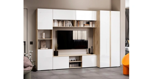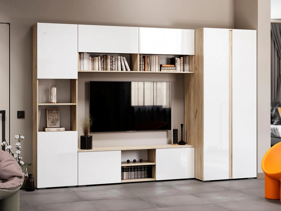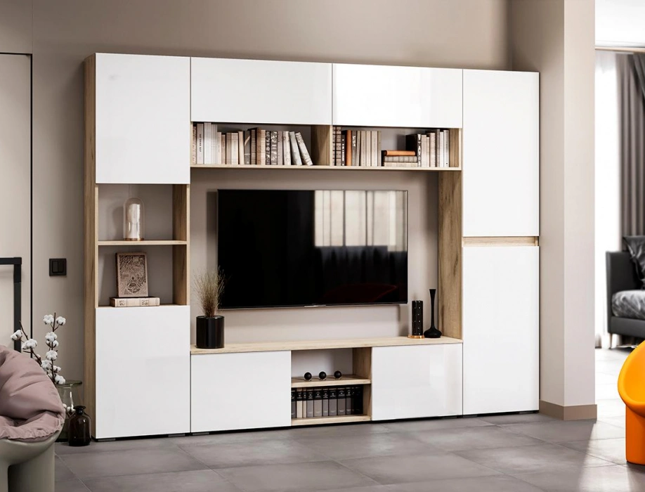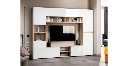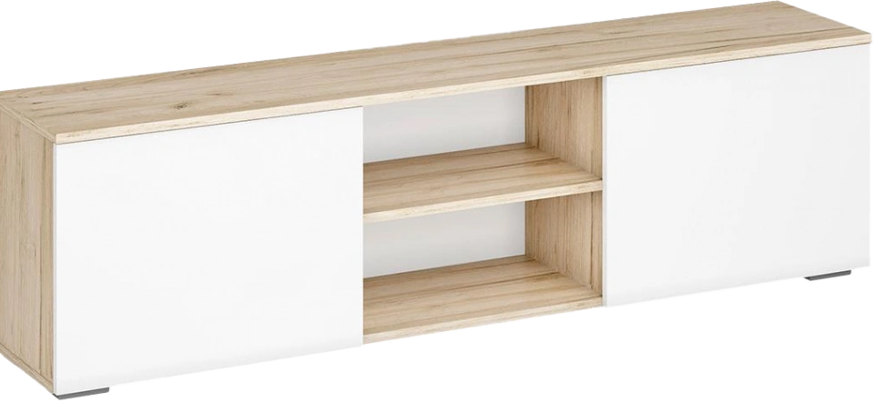 Тумба под ТВ Алетра, c полками, ТБ01-1600, дуб крафт серый / глянец белый