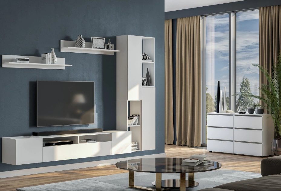 Тумба под ТВ Валенсия, с полками, белый текстурный