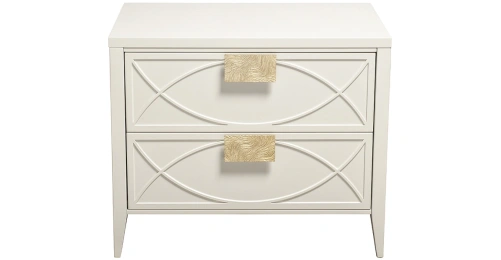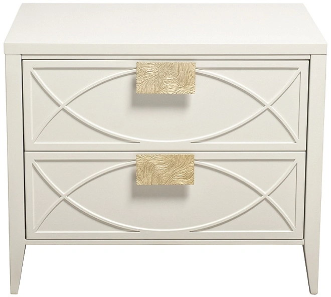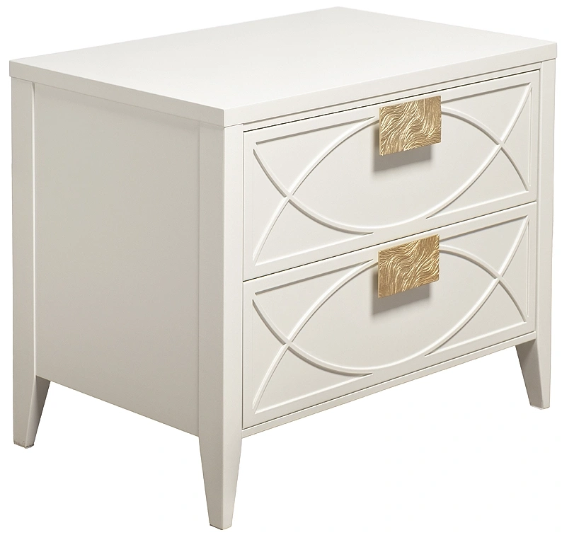 Дизайнерская тумбочка в стиле ар-деко - авторская разработка студии Garda Decor. Бежевый матовый фасад украшен объемным дугообразным декором и широкими рельефными ручками золотого цвета (матовое золото). Два выдвижных ящика прекрасно подойдут для домашней аптечки, хранения белья, щеток, косметики и прочих мелочей. На просторной столешнице будет прекрасно выглядеть одна из настольных ламп в стилистике ар-деко, ассортимент которых широко представлен на нашем сайте. Тонкие ножки придают конструкции легкость и изящество. Эксклюзивная тумбочка станет гармоничным дополнением интерьера спальни, гостиной или прихожей.