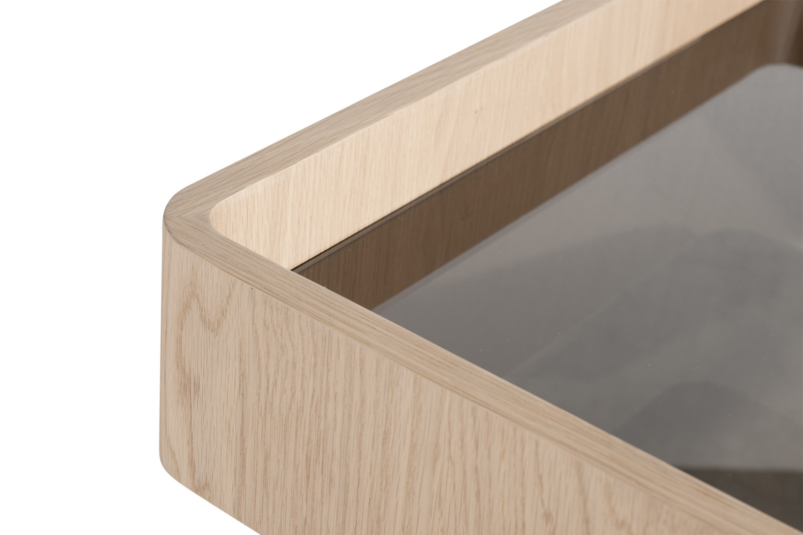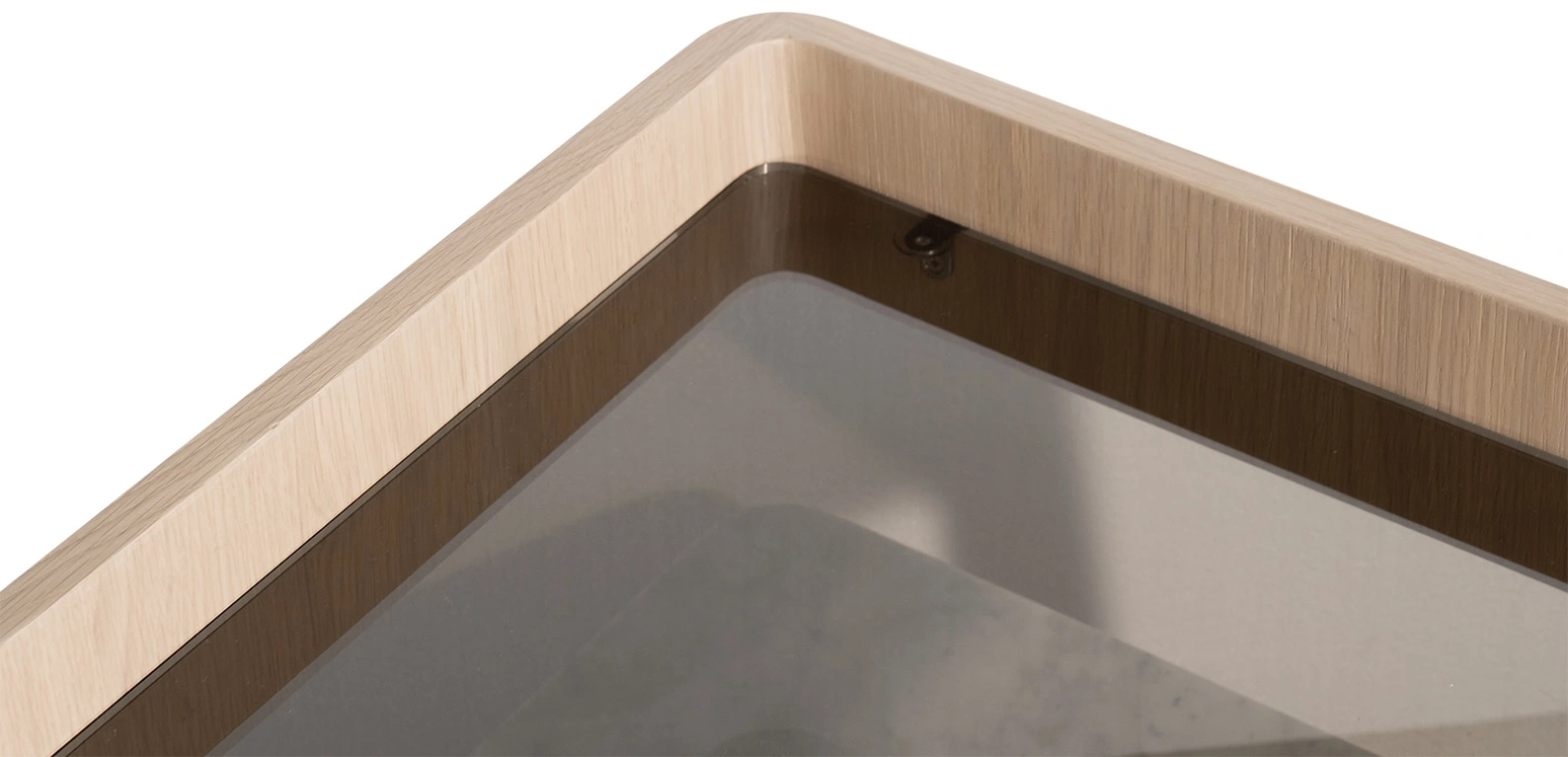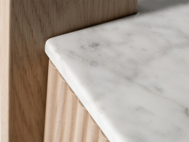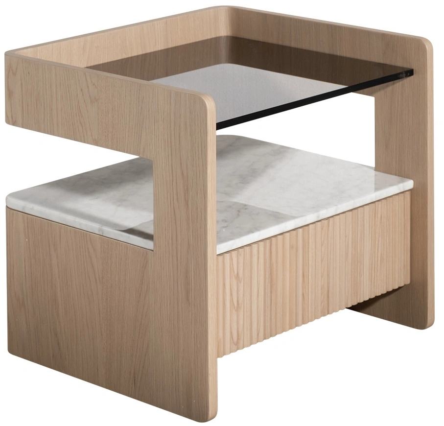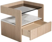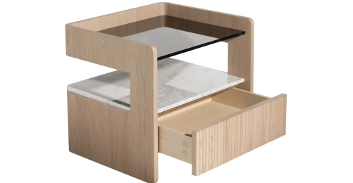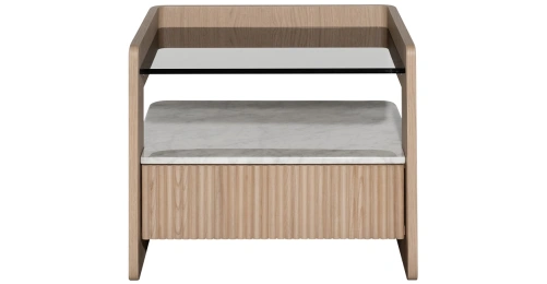 Светлая тумбочка с мраморной столешницей — тонкий баланс между уютом и роскошью. Её корпус из МДФ с текстурой светлого дерева обрамляет полку из прозрачного стекла — лёгкую, будто парящую над основанием. Столешница из натурального мрамора с нежными серыми прожилками уникальна — как отпечаток времени. Ящик спрятан за рельефной панелью, открывается без ручек — плавно, почти бесшумно. Идеальна для спальни или гостиной в стиле ар-деко или фьюжн — где светлая тумбочка с ящиком становится акцентом пространства. Это дизайнерская тумбочка с натуральным мрамором — сдержанная, но выразительная, элегантная без пафоса.