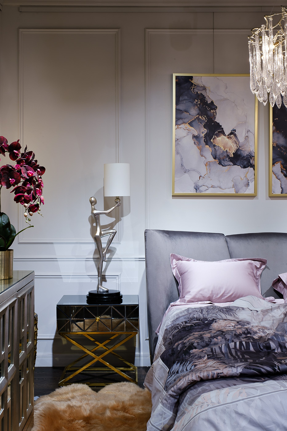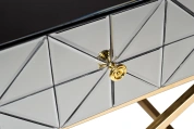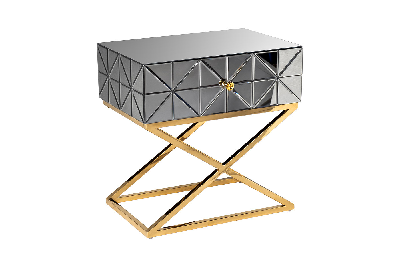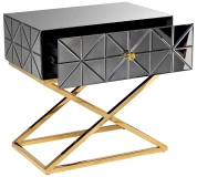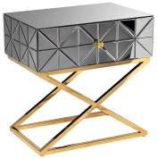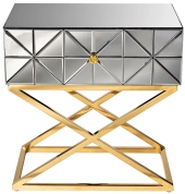 Неординарная тумбочка с выдвижным ящиком дополнит оригинальный интерьер спальни. Поверхность ее фасада собрана из небольших треугольных зеркал, что создает космическое впечатление. Мебель имеет основу из нержавеющей стали цвета золота. Скрещенные ножки гармонично дополняют дизайн зеркальной тумбочки, обеспечивая устойчивость. Представленная модель прекрасно подойдет для интерьера спальни в стиле неоклассики, арт-деко или фьюжн. Тумбочки компактны, поэтому даже в паре не займут много места. А вместительный ящик позволит хранить в нем все, что должно быть под рукой.