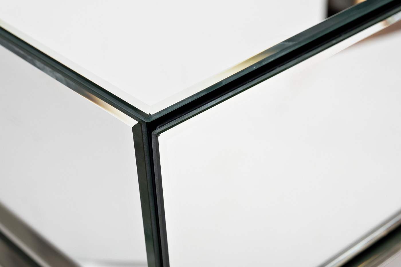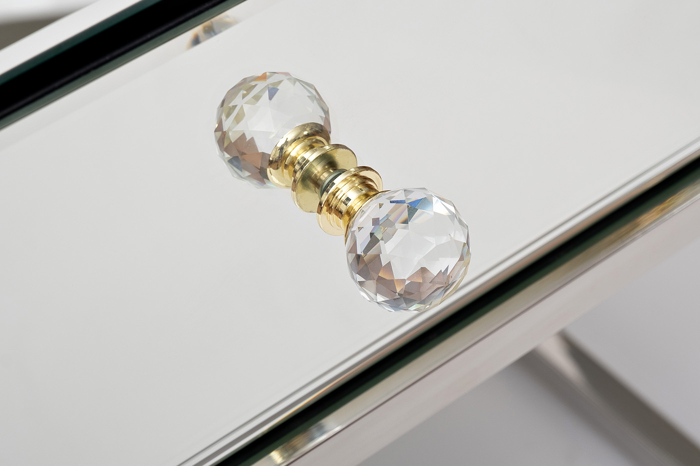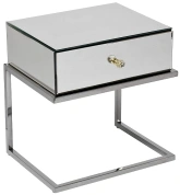 Оригинальная тумбочка на металлическом каркасе привлекает внимание необычной формой – вместо традиционных ножек здесь стальная рама с хромированным блеском. Выглядит такая конструкция весьма интересно и современно. Если ищите нестандартную мебель для спальни в современной стилистике, зеркальная тумбочка станет отличным выбором. Визуально легкая, эффектная, практичная и устойчивая, она украсит собой пространство не только спальни, но и прихожей, коридора, холла.